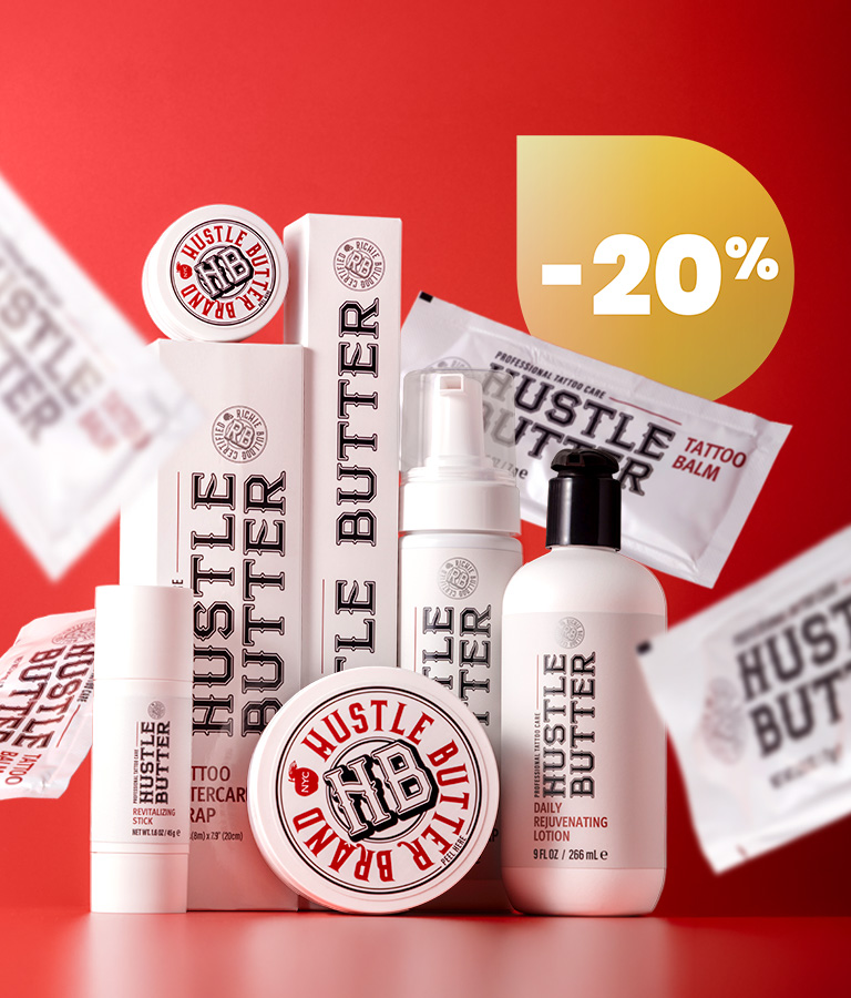 En ce qui concerne la crème pour tatouage, et la crème anesthésiante pour tatouage, nous ne pouvons que recommander Hustle Butter Deluxe comme l'un des meilleurs soins pour le tatouage qui peut également être utilisé avant et pendant le processus de tatouage ! Nous sommes également de grands fans de Recovery Aftercare, et nous avons en stock sa crème hydratante, ses bandages et son savon pour les soins après tatouage.