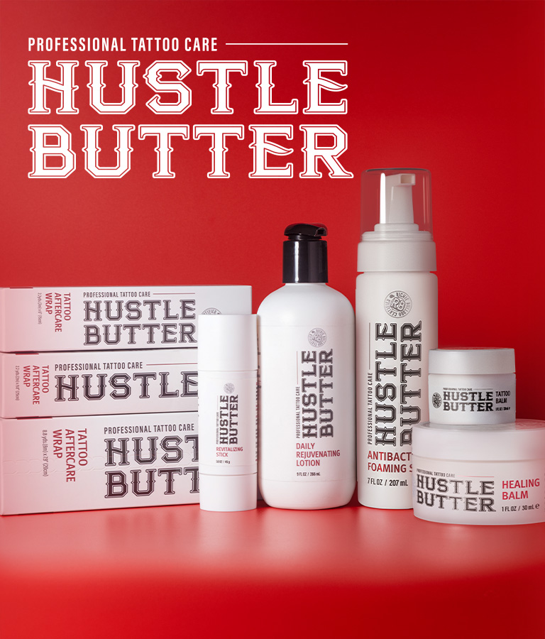 En ce qui concerne la crème pour tatouage, et la crème anesthésiante pour tatouage, nous ne pouvons que recommander Hustle Butter Deluxe comme l'un des meilleurs soins pour le tatouage qui peut également être utilisé avant et pendant le processus de tatouage ! Nous sommes également de grands fans de Recovery Aftercare, et nous avons en stock sa crème hydratante, ses bandages et son savon pour les soins après tatouage.