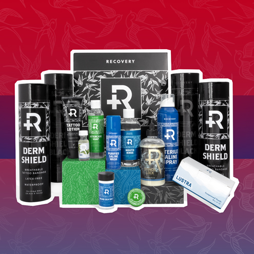 Cet ensemble impressionnant d'une valeur de plus de 250€ contient du stencil lock, des compressées, des soins après tatouage et piercing, ainsi que les très appréciés bandages de protection Derm Shield de Recovery.