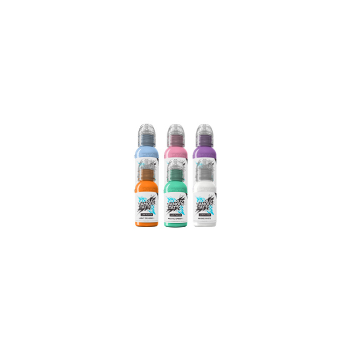 La Pastel Collection de World Famous Limitless contient 6 flacons d'encres de tatouage claires, blanches et pastel, toutes entièrement conformes à la nouvelle réglementation REACH de l'UE qui a été introduite en janvier 2023.