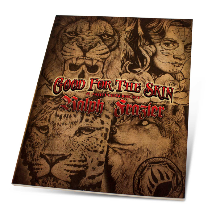 "Good For The Skin" présente 40 pages recto de croquis en noir et gris par Ralph Frazier pour inspirer les artistes tatoueurs dans leurs propres croquis. Les pages sont imprimées sur du papier cartonné couleur crème. Ralph est apprenti chez Stinky Monkey Tattoos.