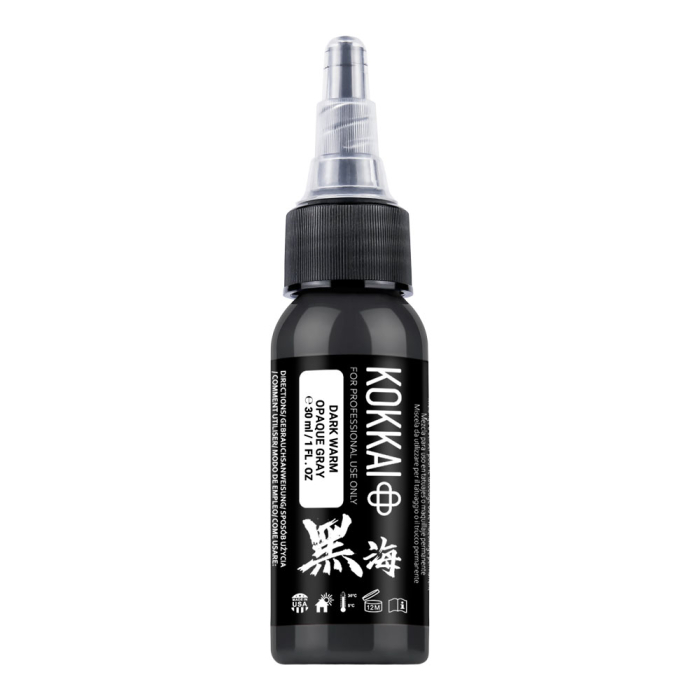 Enhance tattoos with Kokkai Sumi Ink in Dark Warm Opaque Grey, part of a 5-shade set designed to bring depth, warmth, and softness to your tattoos. Infused with white for a creamy opaque finish, these warm-toned greys are perfect for portraits, realism, black and grey work, and organic elements in designs.