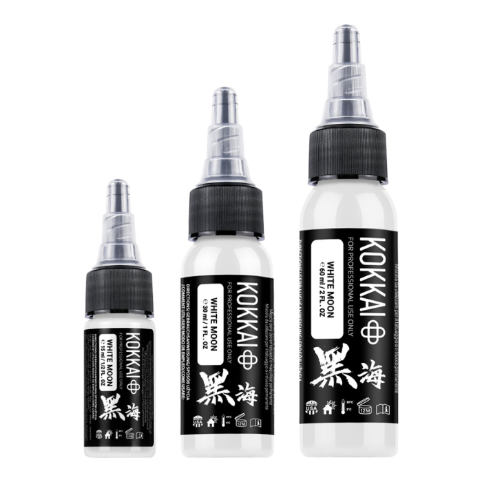 Create bold, opaque highlights with Kokkai Sumi Ink in White Moon, perfect for crisp details, soft gradients, and enhancing contrast in both black and grey tattoos as well as colour designs.