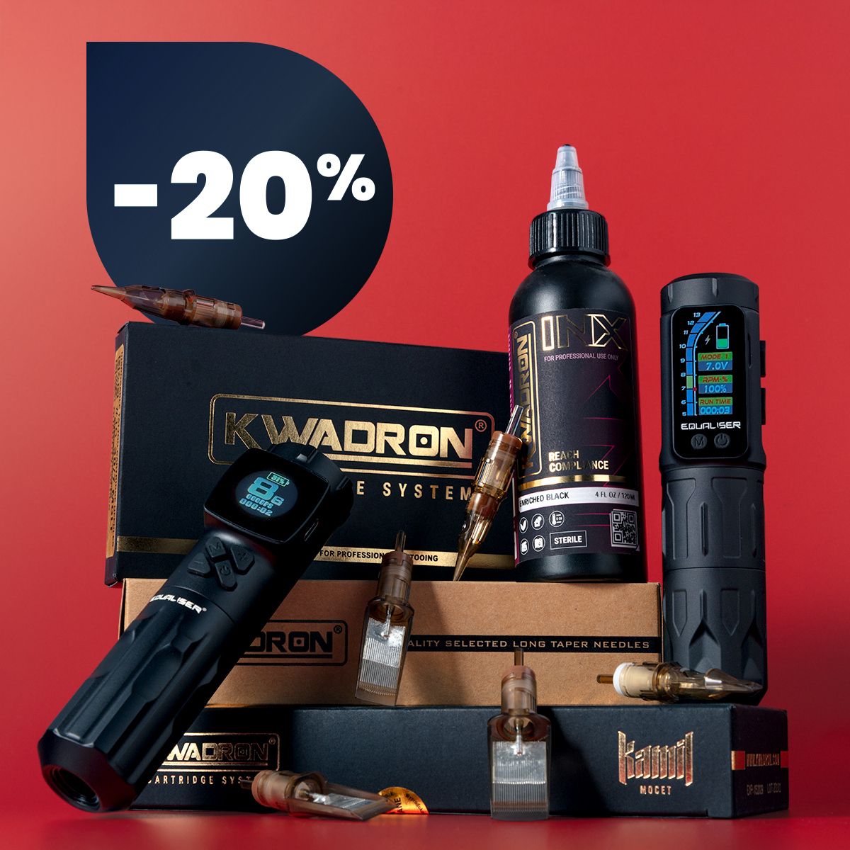 Améliorez votre équipement avec Kwadron ! Nous réduisons les prix Kwadron pour une durée limitée, vous permettant de vous équiper facilement avec certains des outils de tatouage les plus précis du marché.