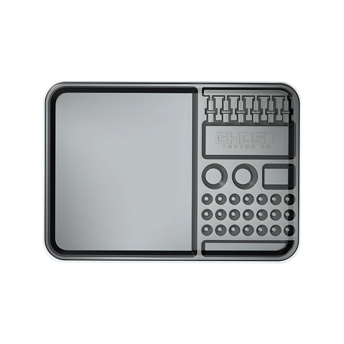 Ces plateaux en PET 100 % recyclables s'adaptent parfaitement au plateau standard Ghost, avec des sections dédiées pour tout ce dont vous avez besoin, y compris 25 porte godet à encre, 6 fentes pour cartouches, 2 porte-gobelets d'eau, un porte-gobelet ou éponge supplémentaire et une fente pour les lignes de glide ou les soins après tatouage.